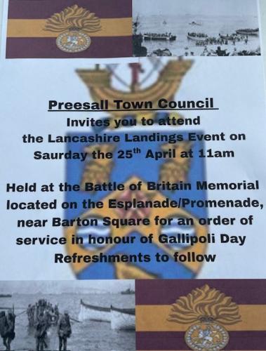 Preesall Town Council invites you to join the Civic Party to assemble at the Battle of Britain Memorial located on the Esplanade/Promenade, near Barton Square at 10.45am for an order of service in honour of Gallipoli Day to start at 11am